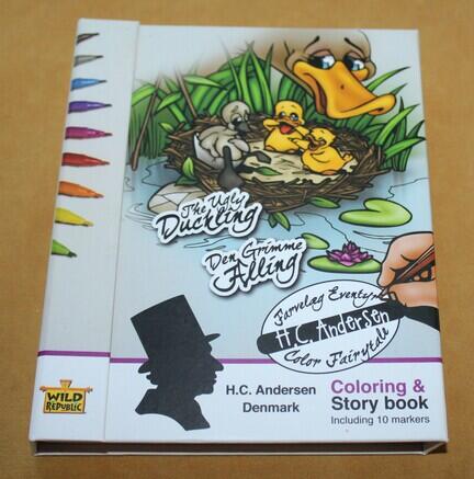Der mangler 1 tusch, der er kun 9 stk. Bogen har først nogle sider der skal farvelægges, og derefter har bogen fortællingen på både dansk og engelsk.